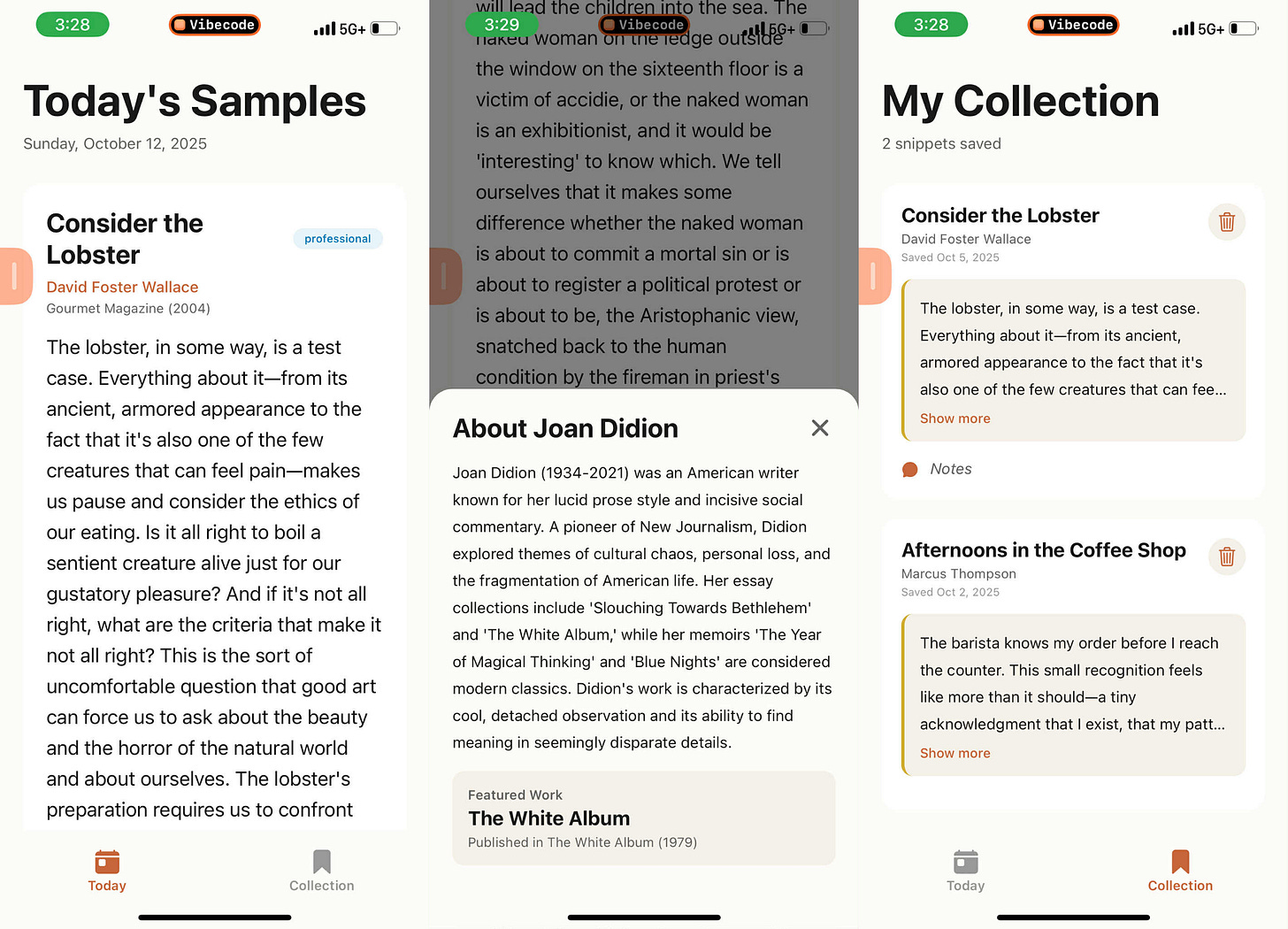 I used this app called Vibecode to create a simple app that pulls writing snippets from different authors every day, allows me to see the background of the author, and save quotes and notes from each passage as inspiration for my own.