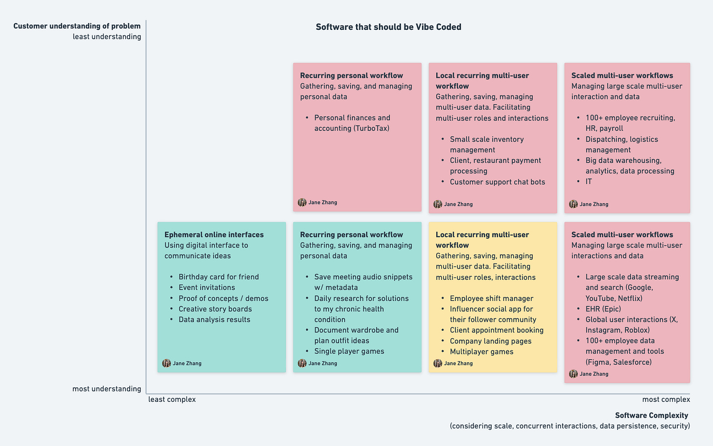 The y-axis is simple. People should only vibe code software for problems they understand and have opinions about. For example, I’m a restaurant owner, and I want software that helps me manage my employees’ work shifts. I want a simple interface that let’s employees sign up for shifts, trade shifts, ask for time off, and receive reminders to make sure the restaurant is always staffed. Right now, I can buy a general purpose shift tracking app or pay a dev shop to set something up. In the former, I may be lucky and find something that exactly fits my requirements, but commonly with general solutions there is a “last mile delivery” problem where some set of requirements are missing or there are additional bundled features that make the platform more noisy and costly than what I need. In the latter, sitting with a dev shop to communicate my needs and paying retainer for maintenance and additional features over time leaves me in a costly and suffocating place.